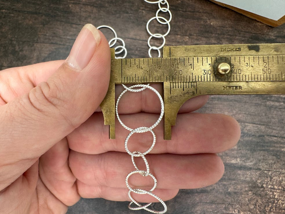 Brass base with plating. Fine silver matte on this stunning 18mm Twisted Circle Chain . All have a lacquer coating to protect the finish. Made in Germany. $8.50 per foot.