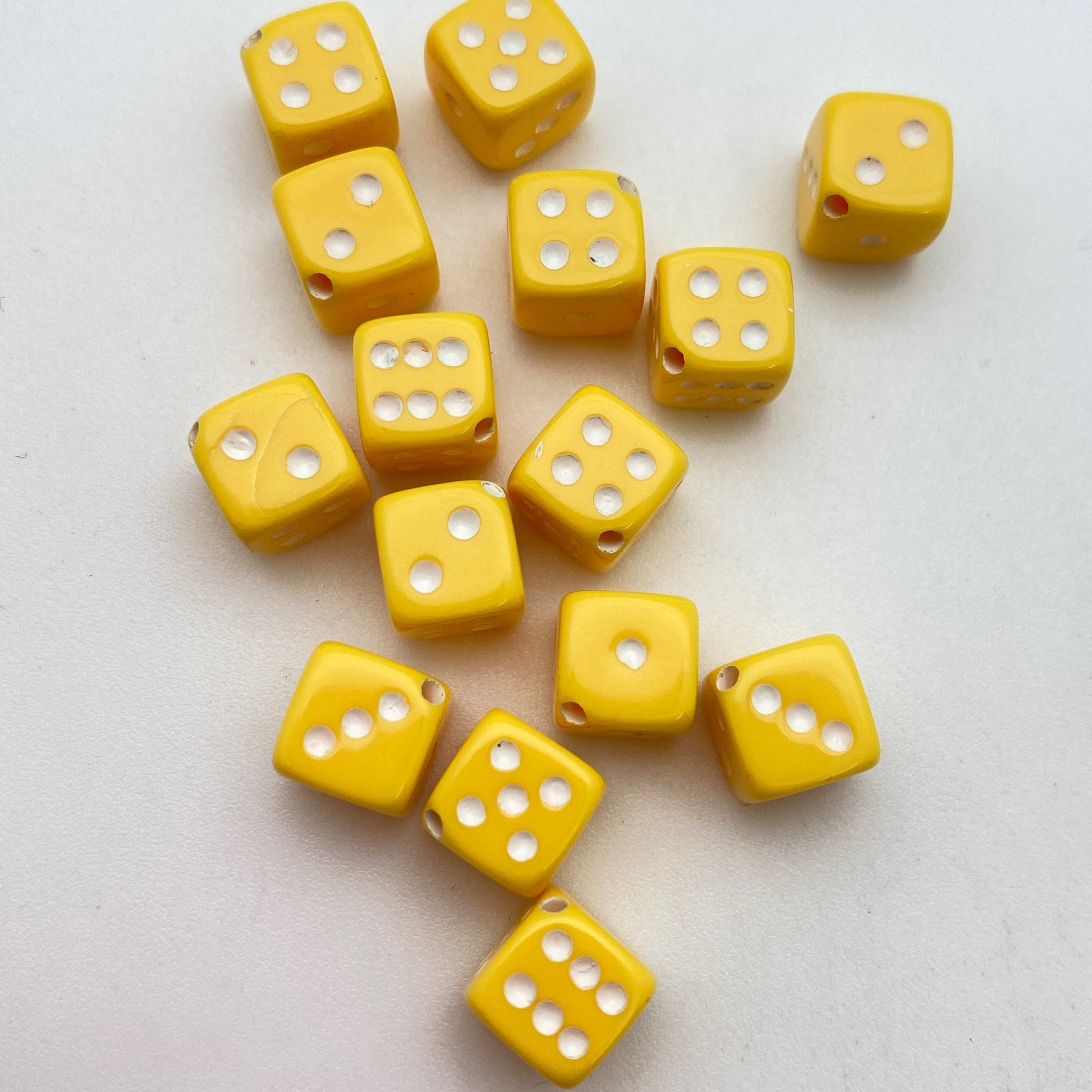 Dice shaped beads 9mm yellow with white dots. German resin. 10 beads to a lot.