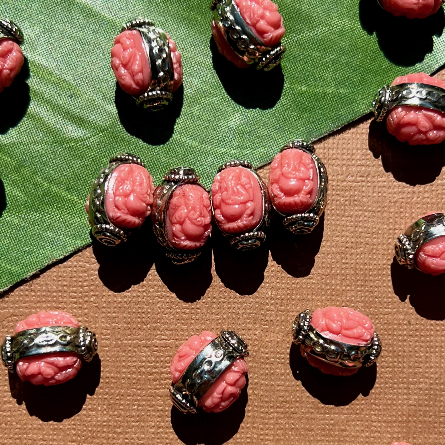 Carved resin Ganesha cabochons are set in white metal to make a stunning one-of-a-kind beads. Handmade in Nepal.