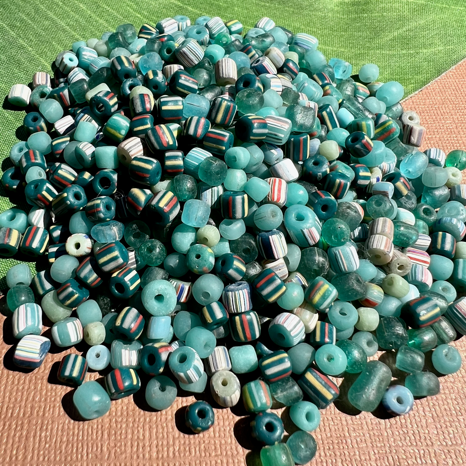 Indonesian glass beads are hand-made in Indonesia. They are often made with recycled glass and are thought to resemble old African trade beads.