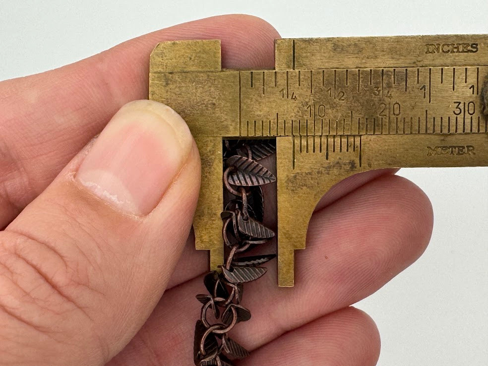 Charming dangle chain with antique copper plated leaves adorning them. A sturdy brass base with antique copper plating. Leaves are approx 7mm . All have a lacquer coating to protect the finish. Made in Germany. $14 per foot.