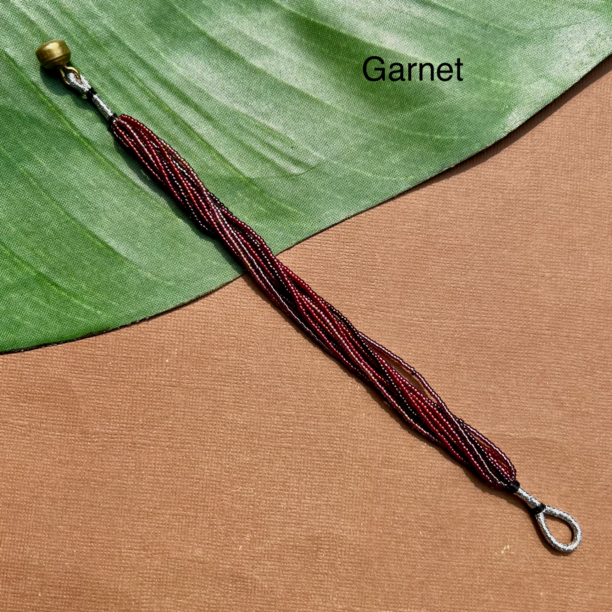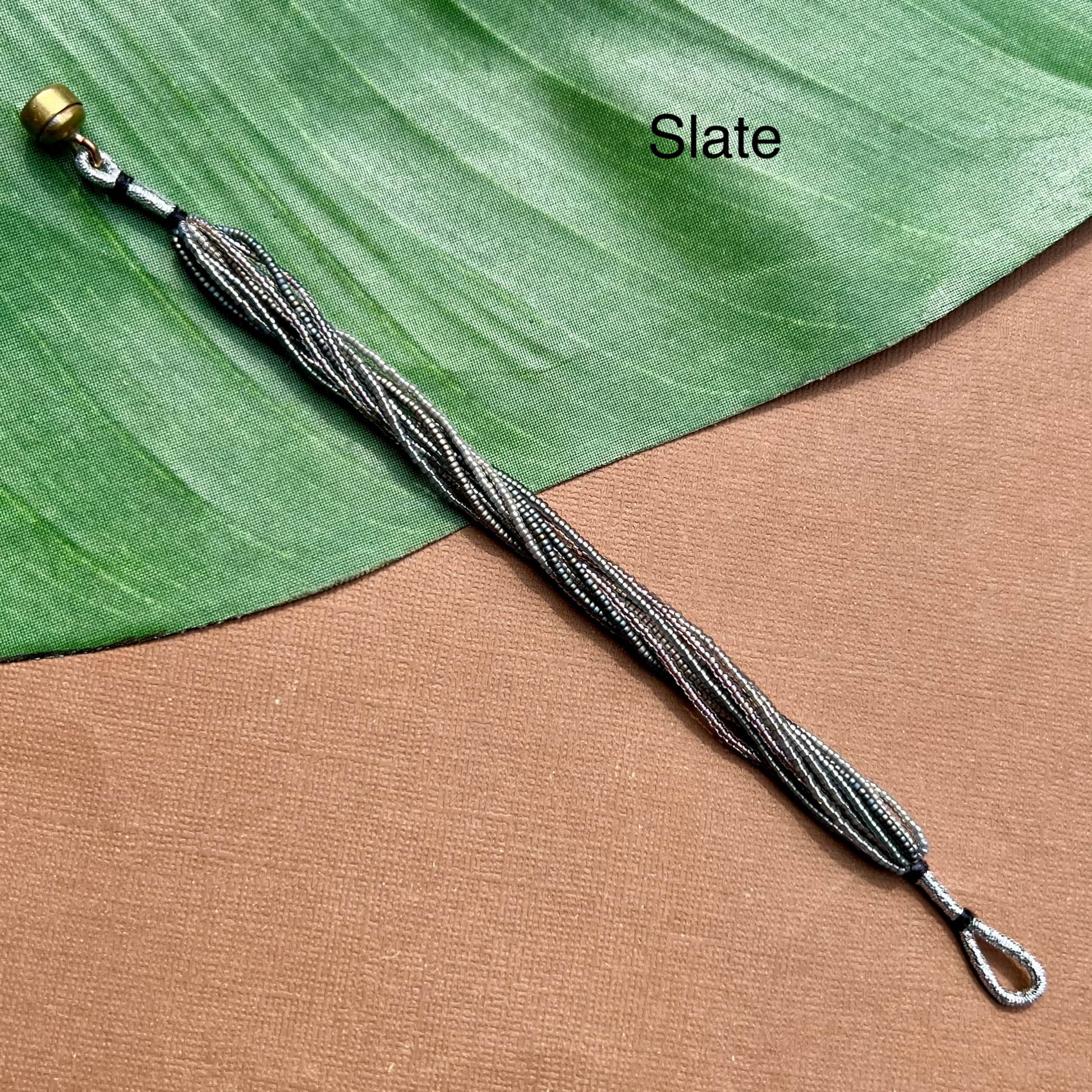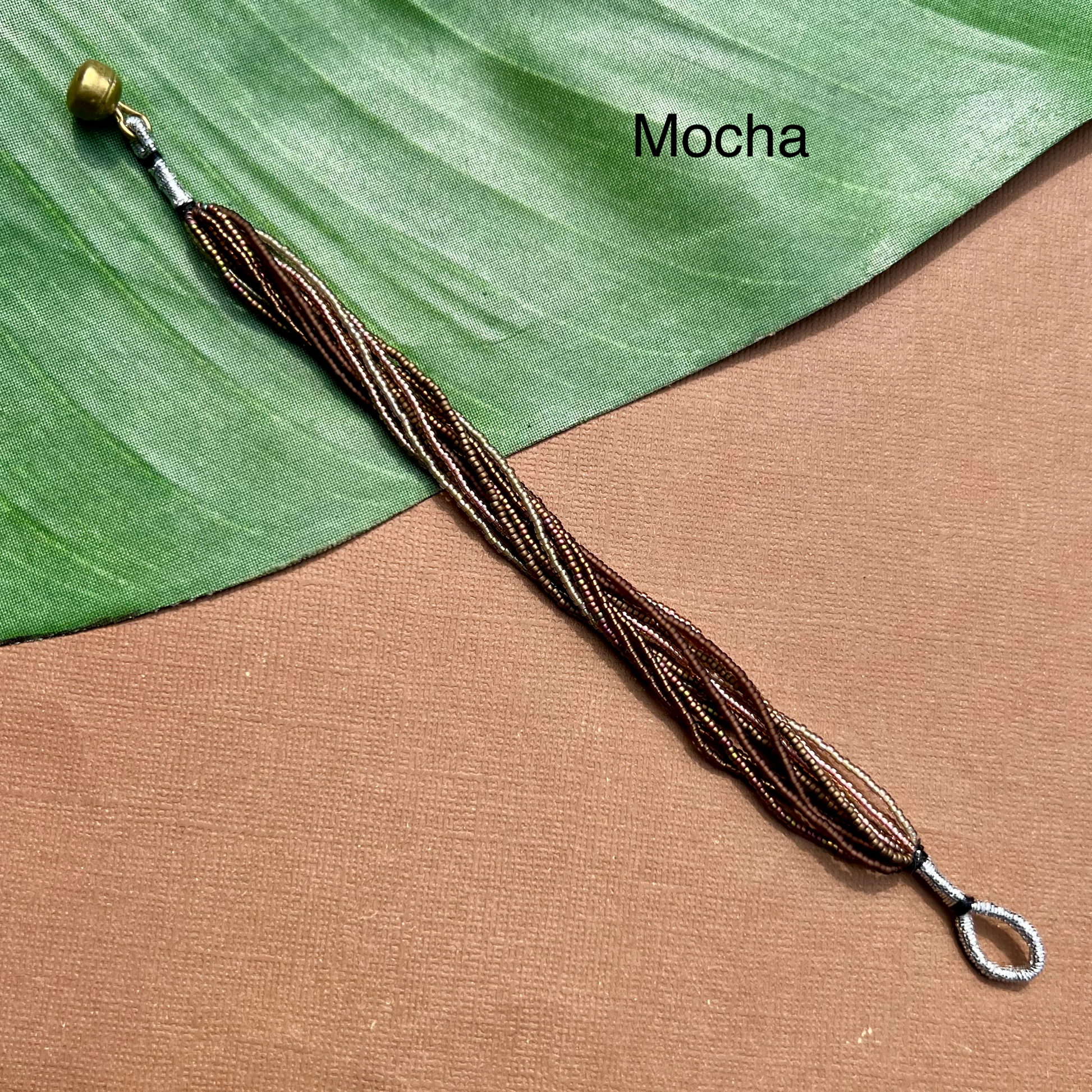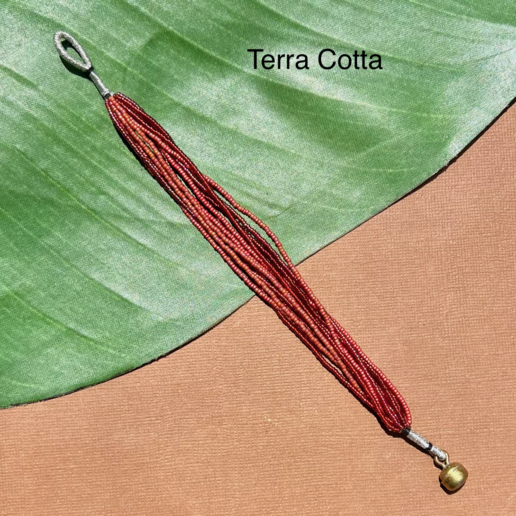Seed Bead Bracelets are made in Nepal with Miyuki size 15 Japanese glass seed beads.  12 strands are strung together and finished with a lotus button clasp.