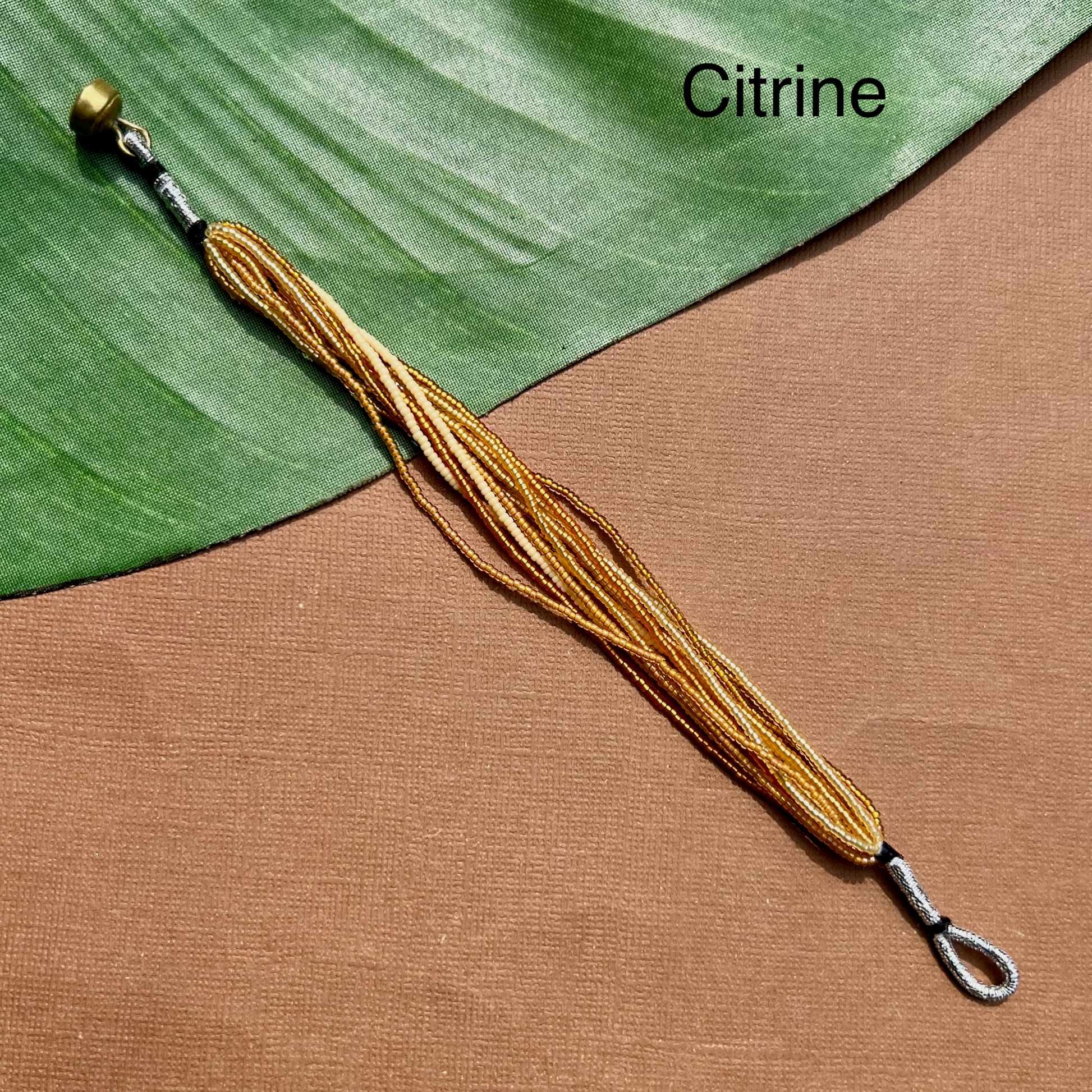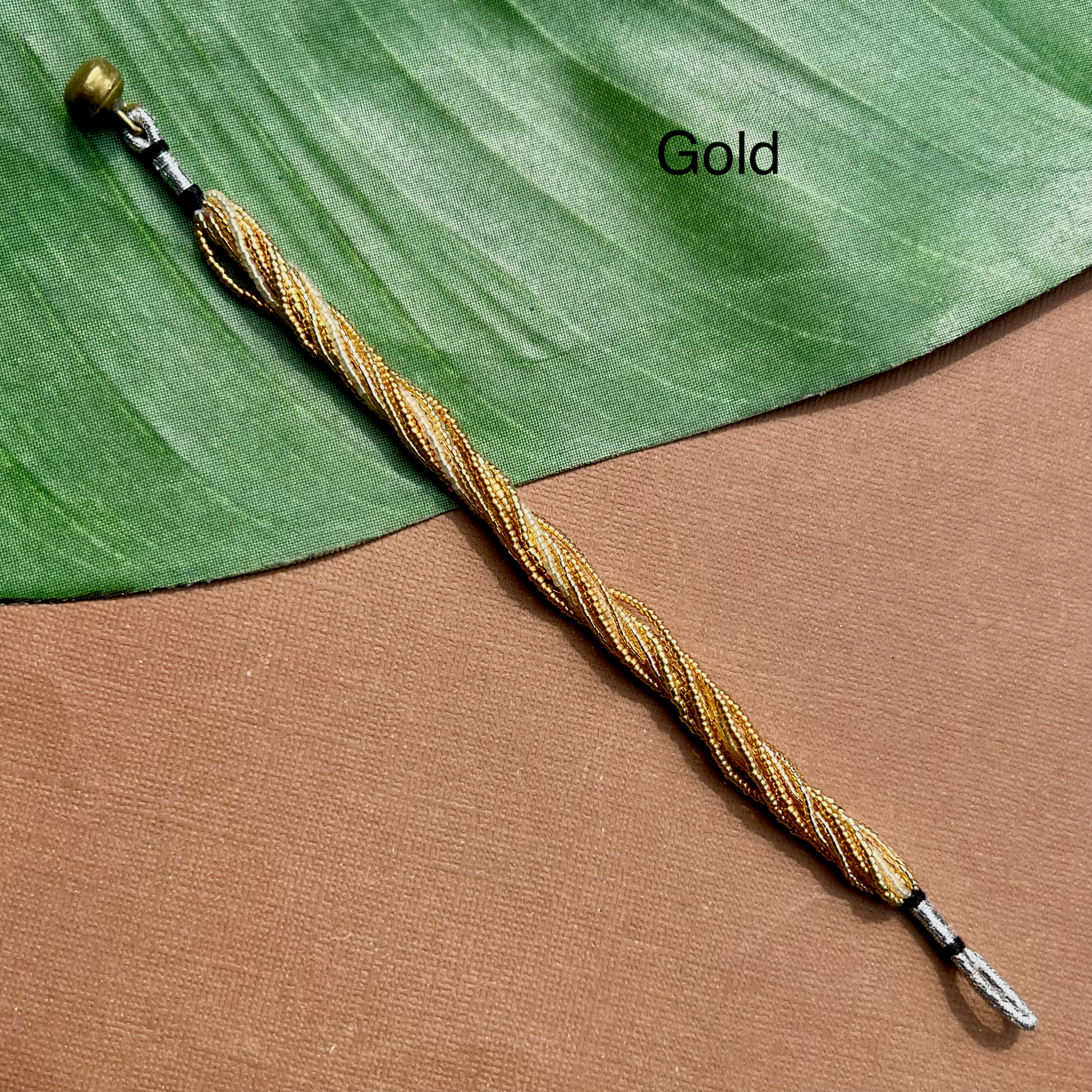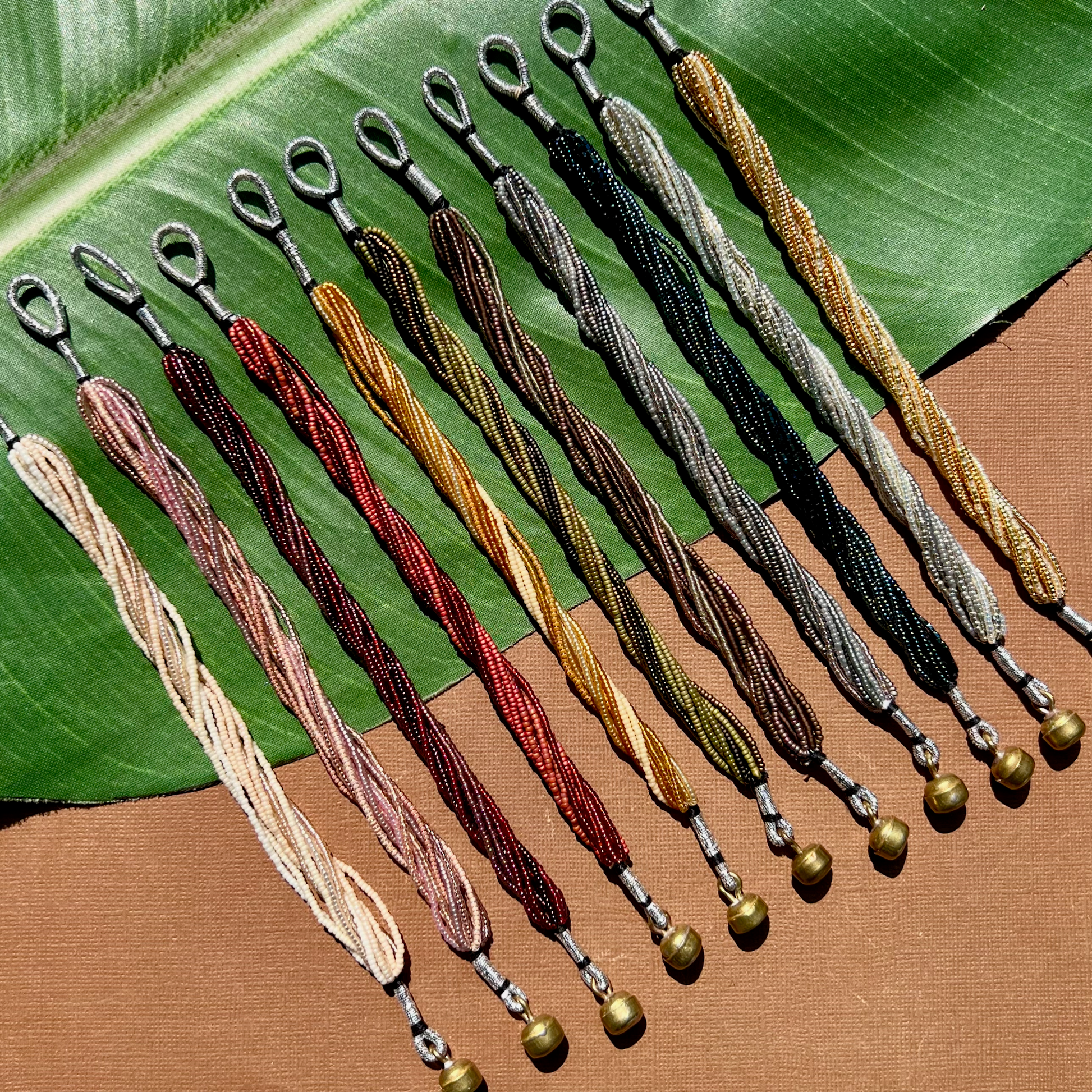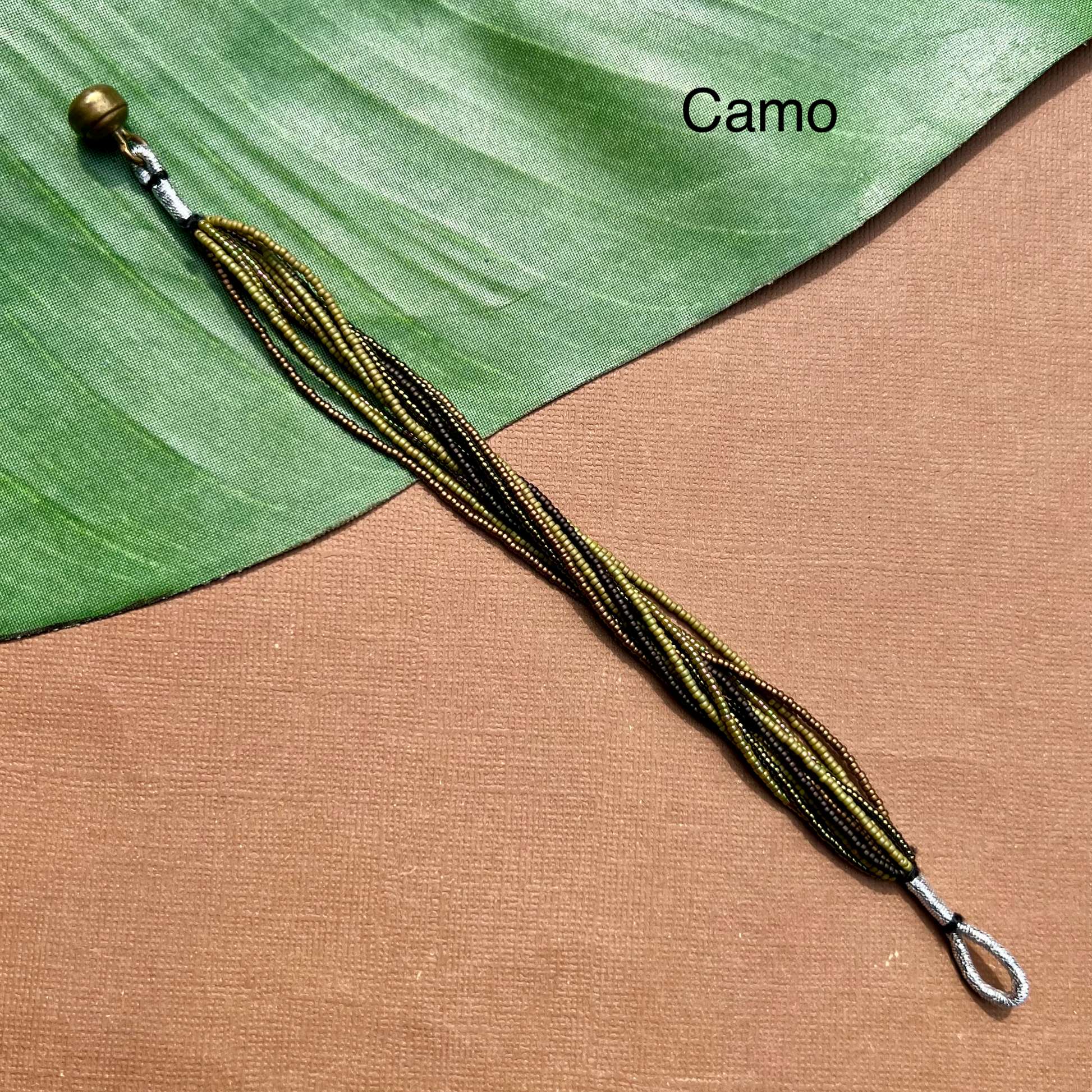 Seed Bead Bracelets are made in Nepal with Miyuki size 15 Japanese glass seed beads.  12 strands are strung together and finished with a lotus button clasp.