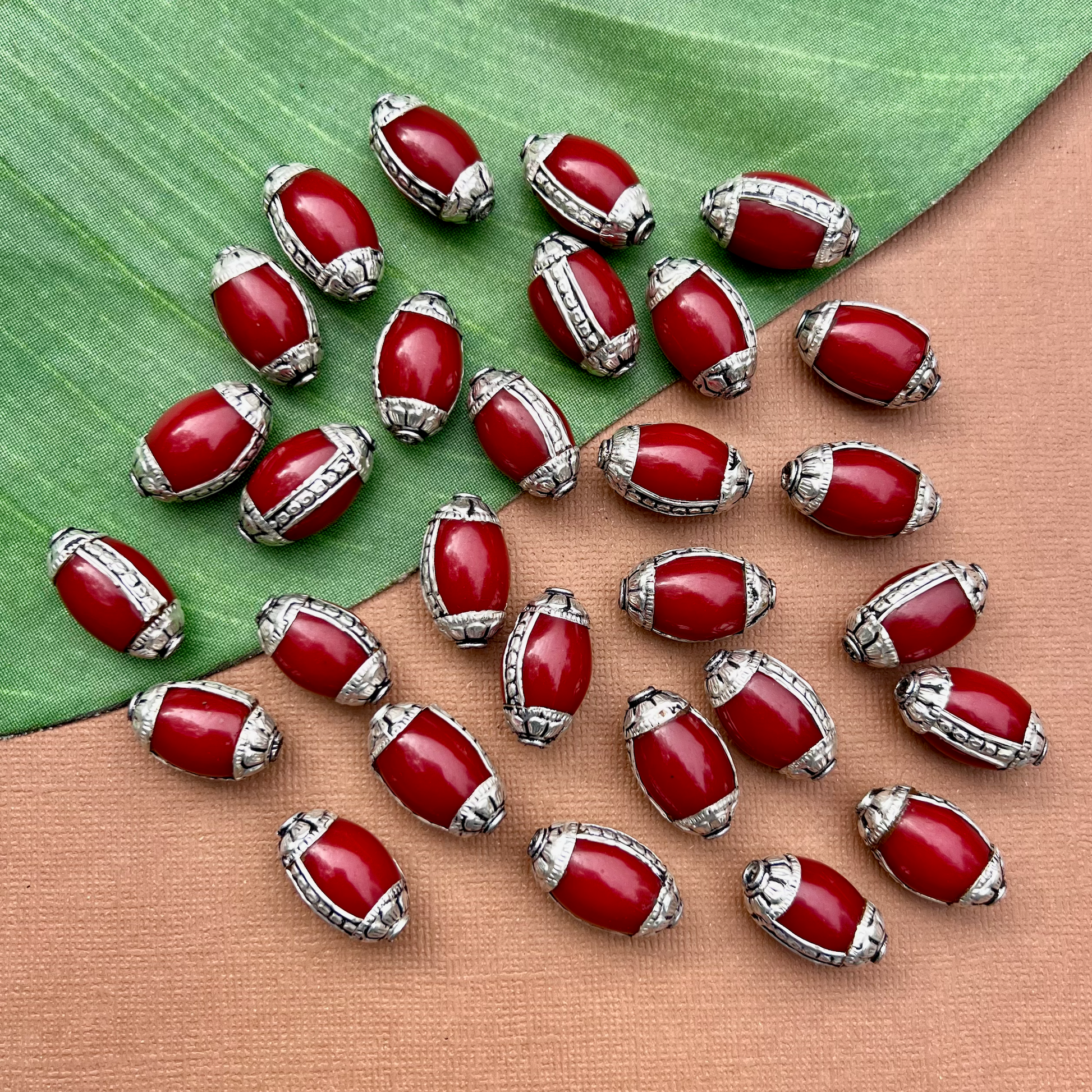 Red resin cabochons are set in white metal to make stunning one-of-a-kind beads. Handmade in Nepal. These unique beads are a beautiful addition to any design.