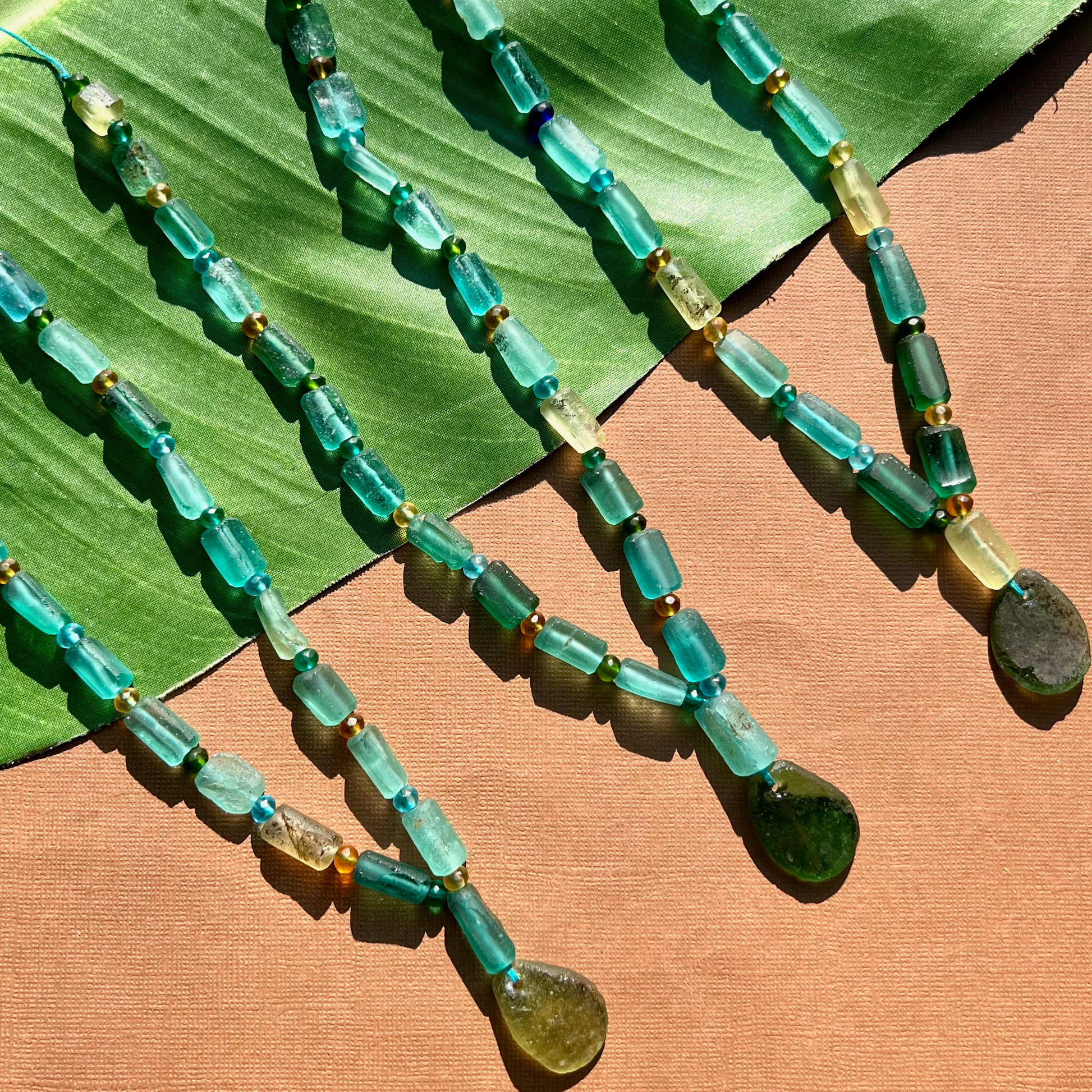 Ancient Silk Road glass is found along the old trade route known as the Silk Road. Silk Road glass is often referred to as Roman Glass. Strands are temporarily strung.
