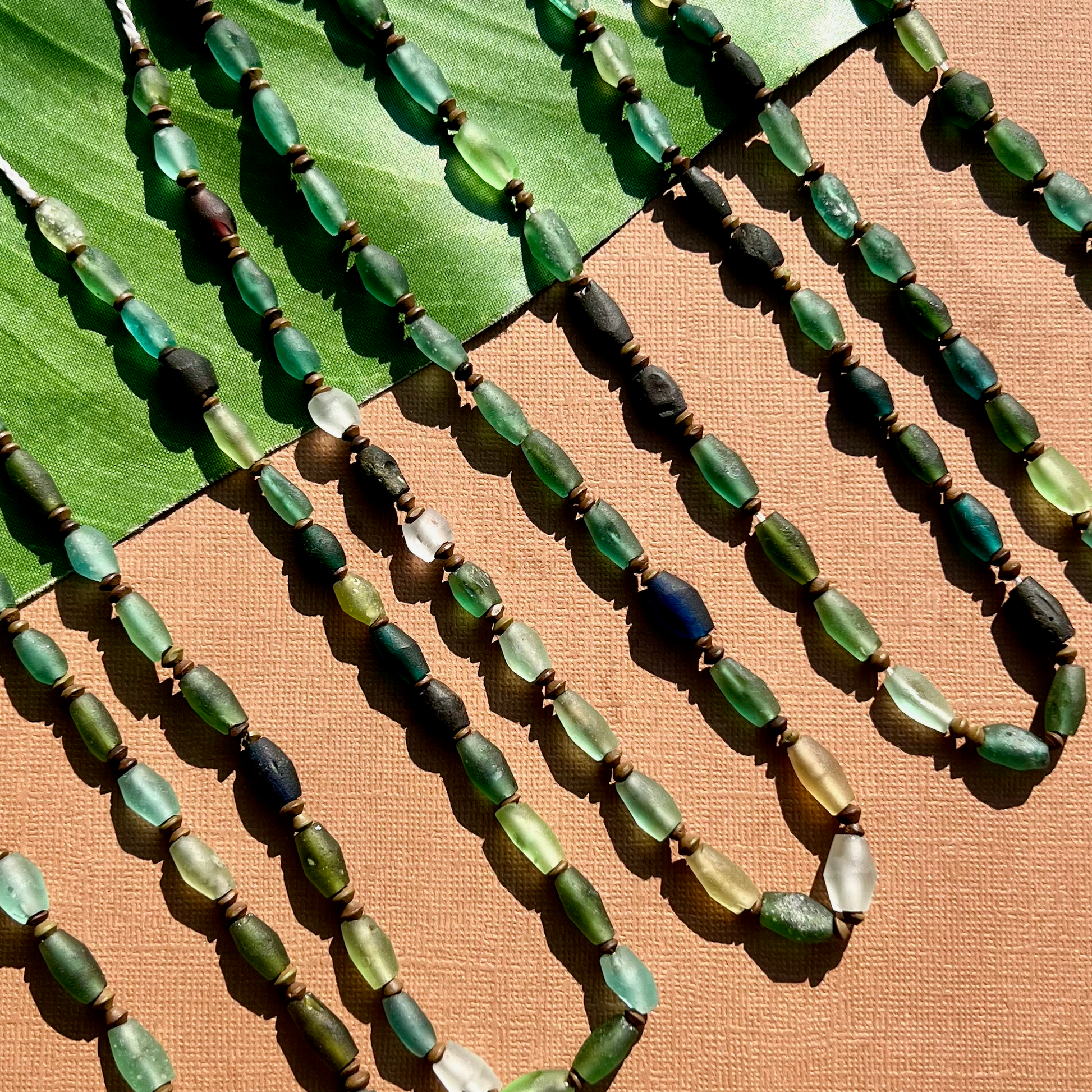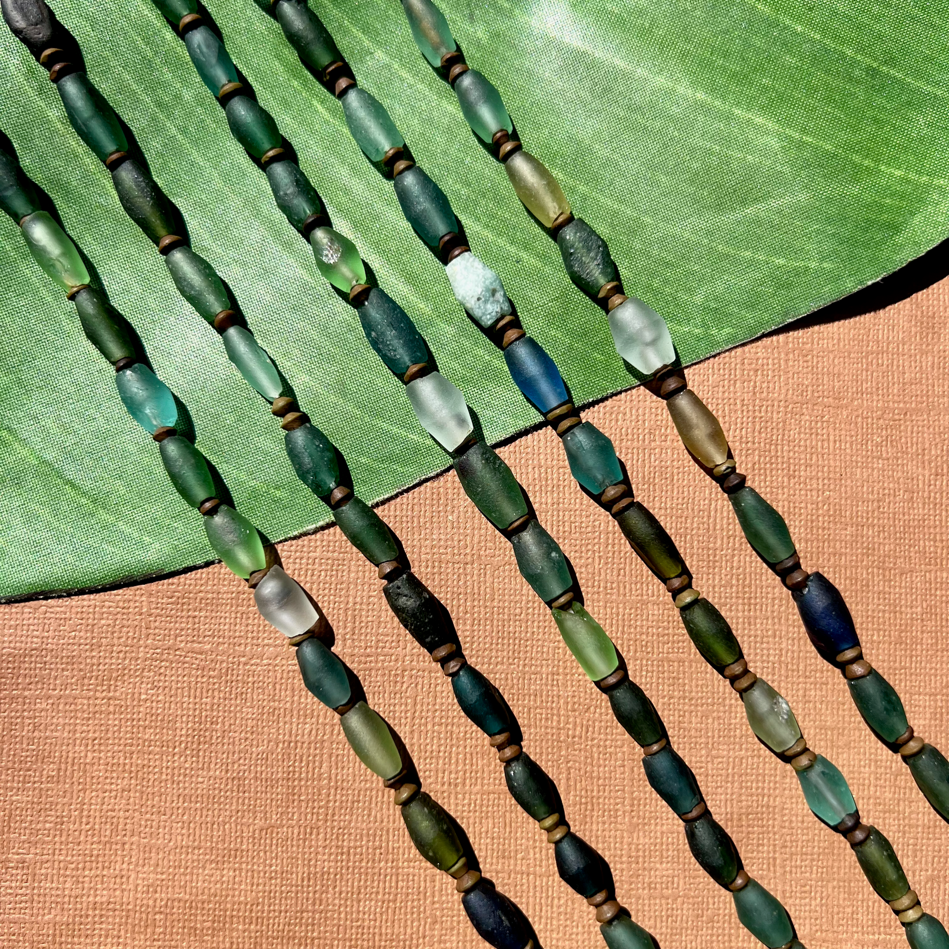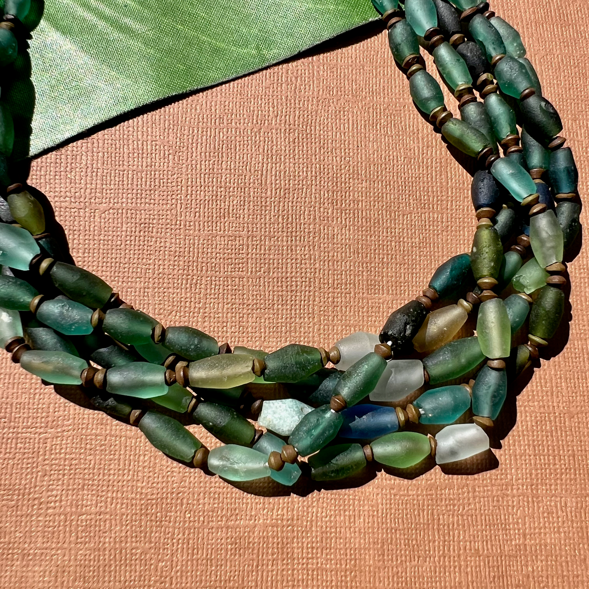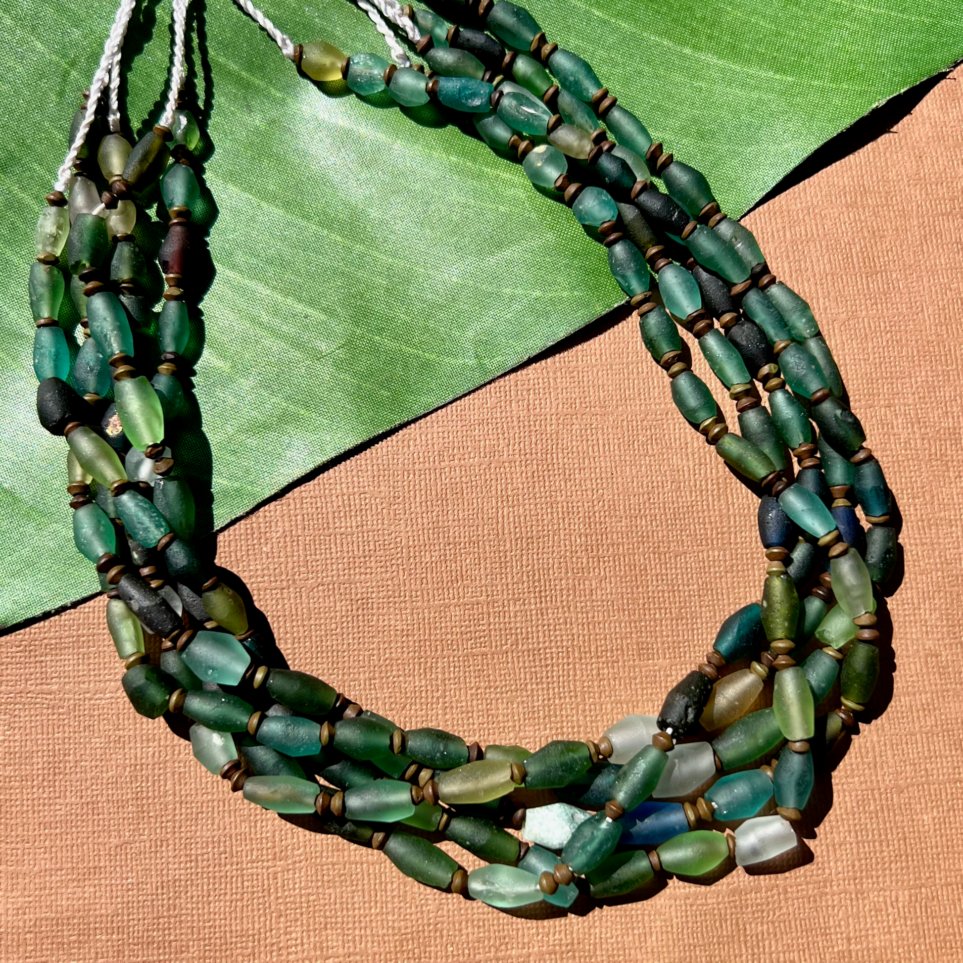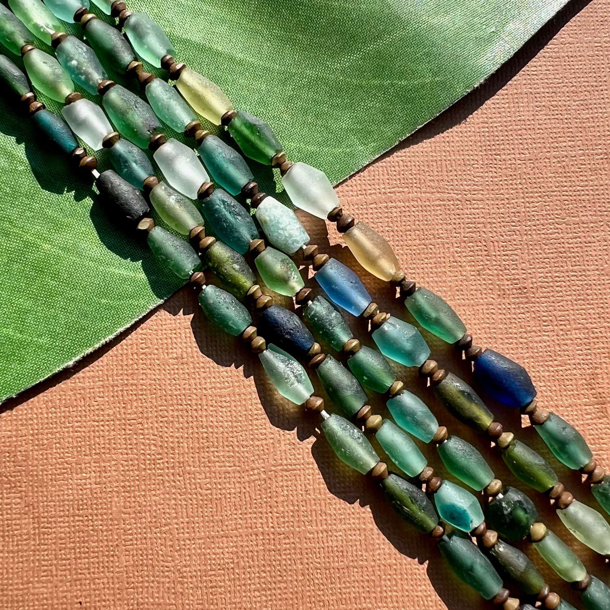 Ancient silk road glass is found along the old trade route known as the Silk Road. Silk road glass is often referred to as Roman Glass. Strands are temporarily strung.