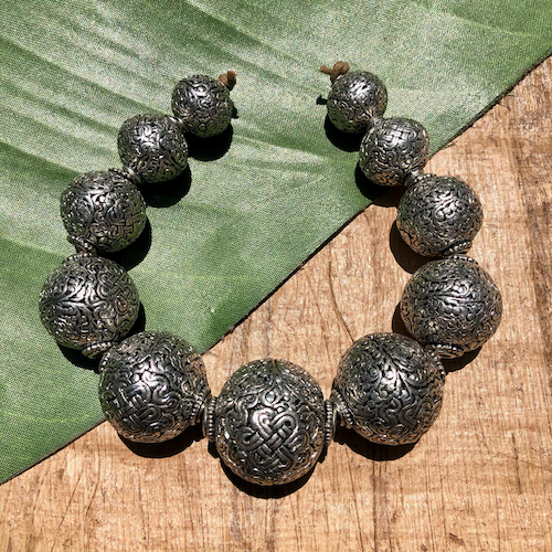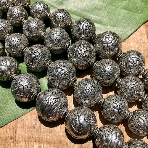 Hand-carved copper beads from Nepal. Sterling silver plated in the United States.