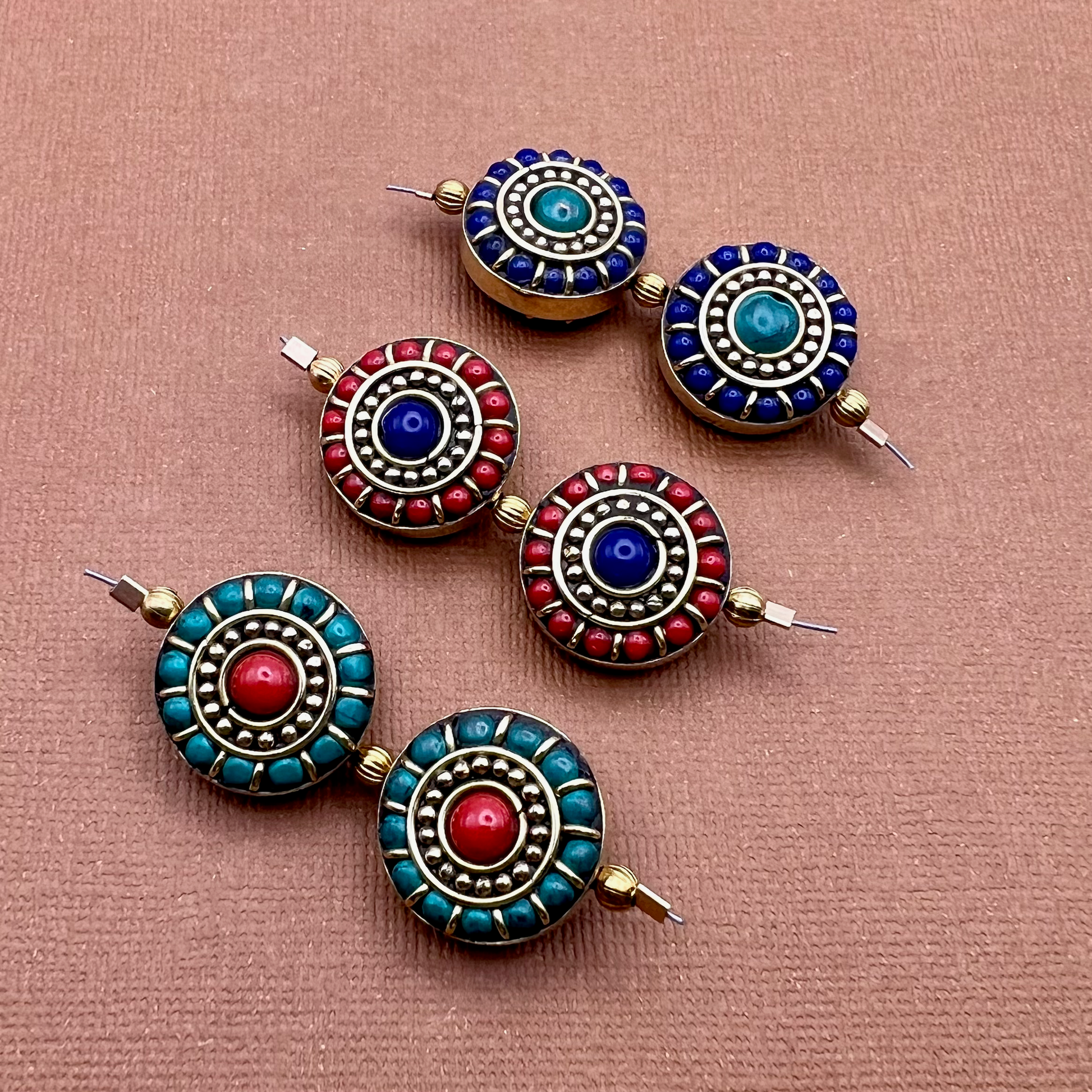 Tibetan brass disc beads with inlay lapis & turquoise, turquoise & coral, and coral & lapis.  Handmade in Nepal.